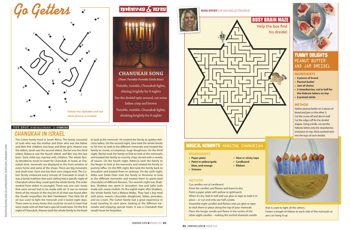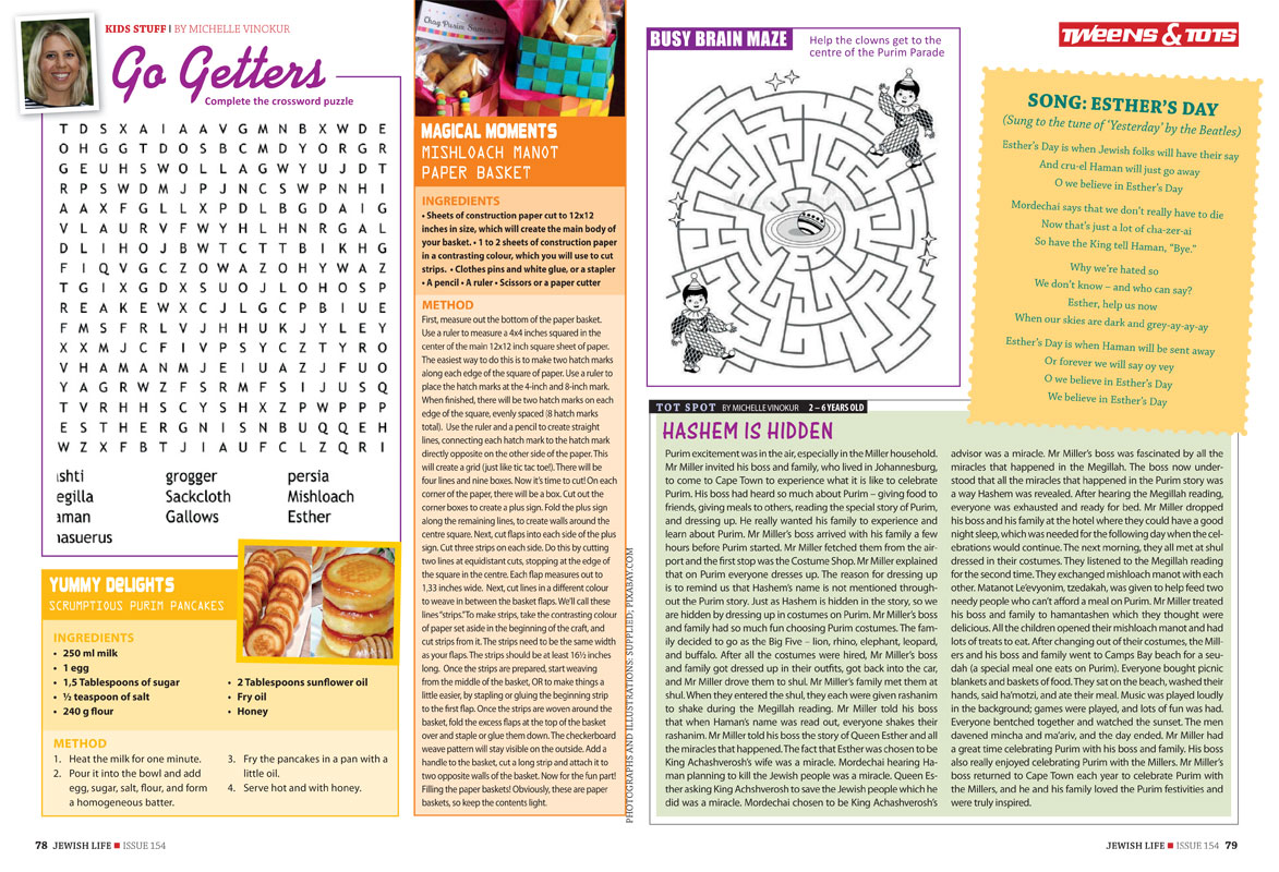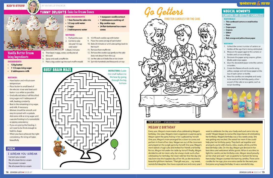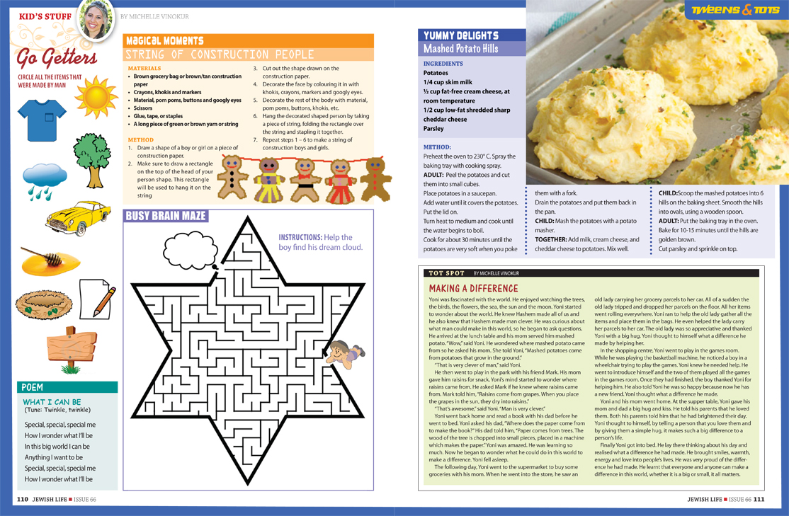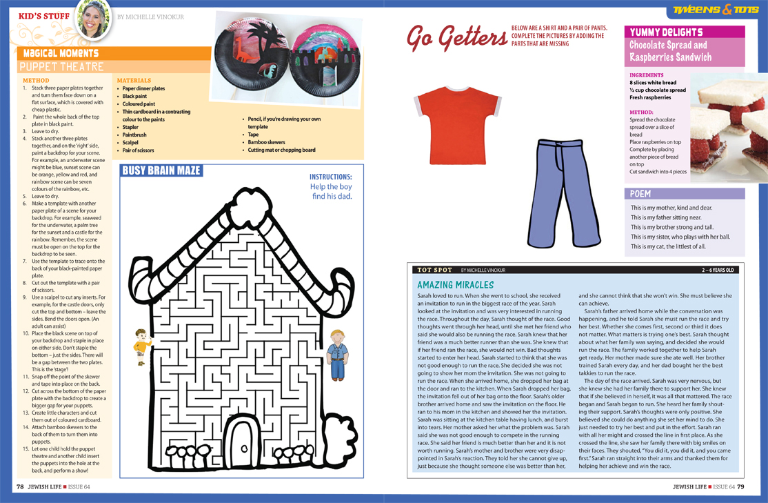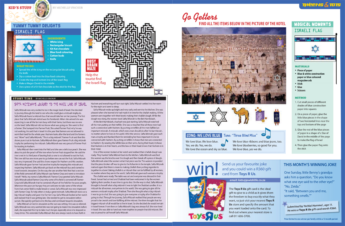 The Jewish Life is the highest circulating publication to the SA Jewish community. The magazine is filled with the best local and International content that conveys the essence of Jewish life. Readers can engage in numerous articles about lifestyle, parenting, business, belief, philosophy, history, health, community. Included in the magazine is a section dedicated to children's education. The children's section provides games, stories, recipes and fun activities that impart jewish values and beliefs. View all the children's pages below and have fun doing all the activities with your children; or you can buy the magazine. The magazine is also available nationwide in South Africa in all shuls, Jewish day schools, selected retail outlets, as well as on all El Al flights from Johannesburg to Israel (business and economy Class).