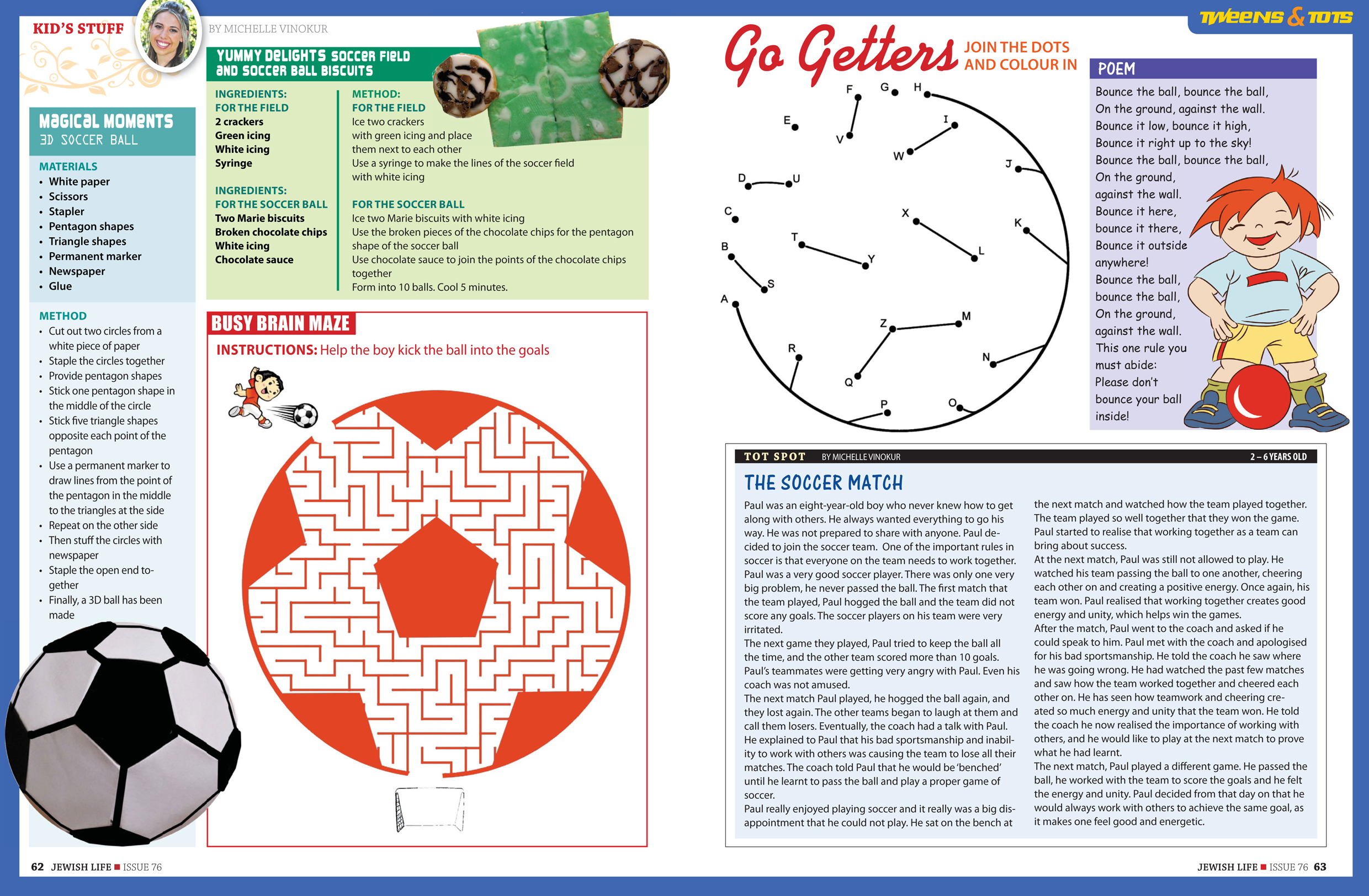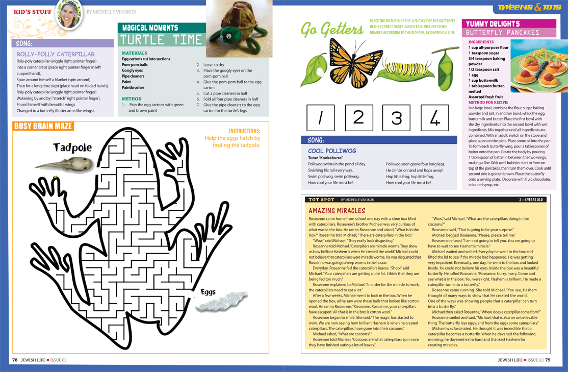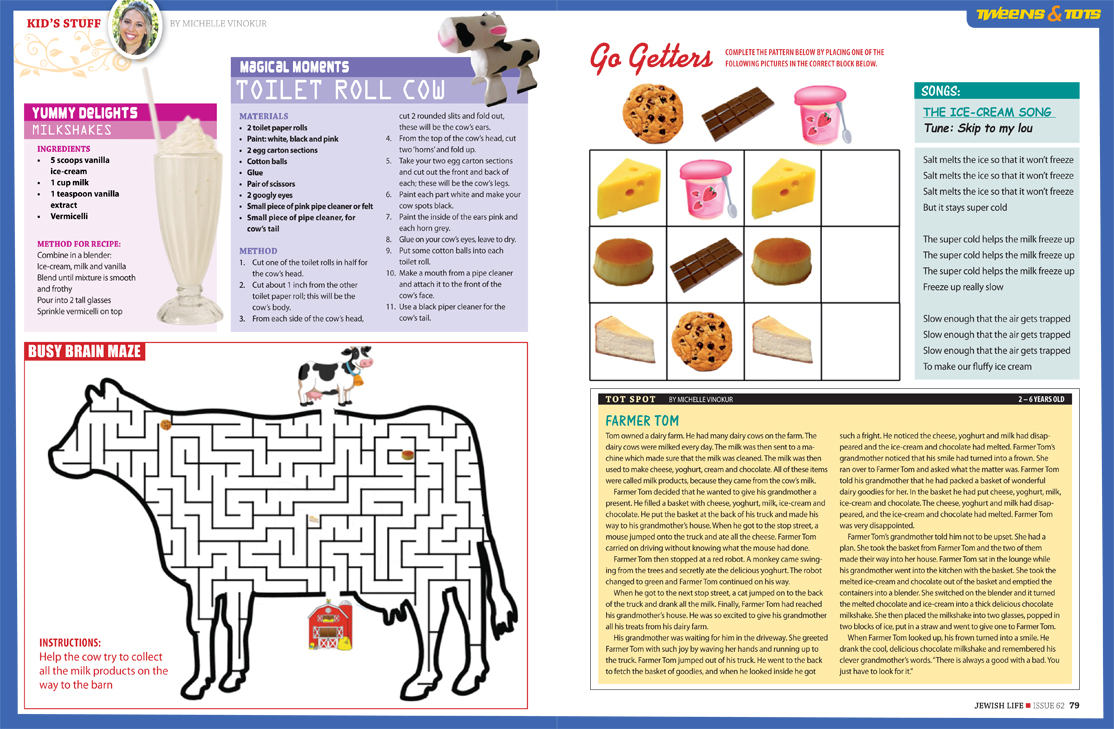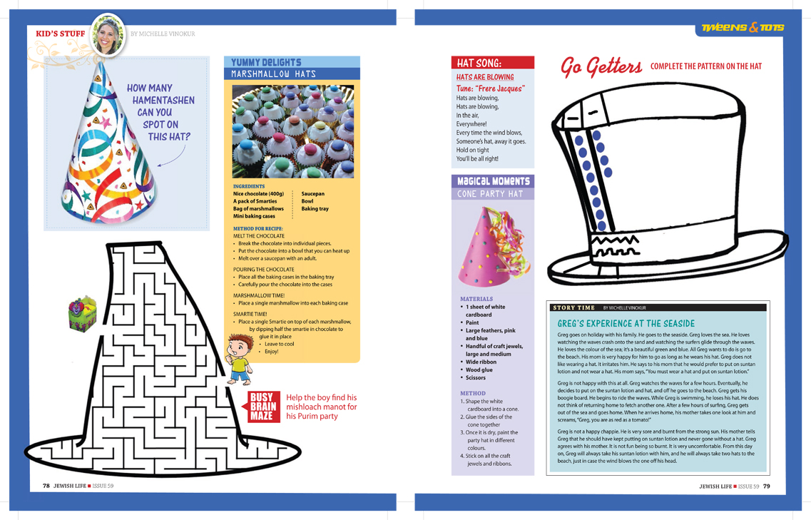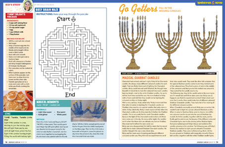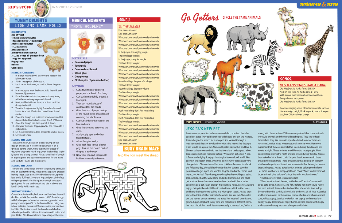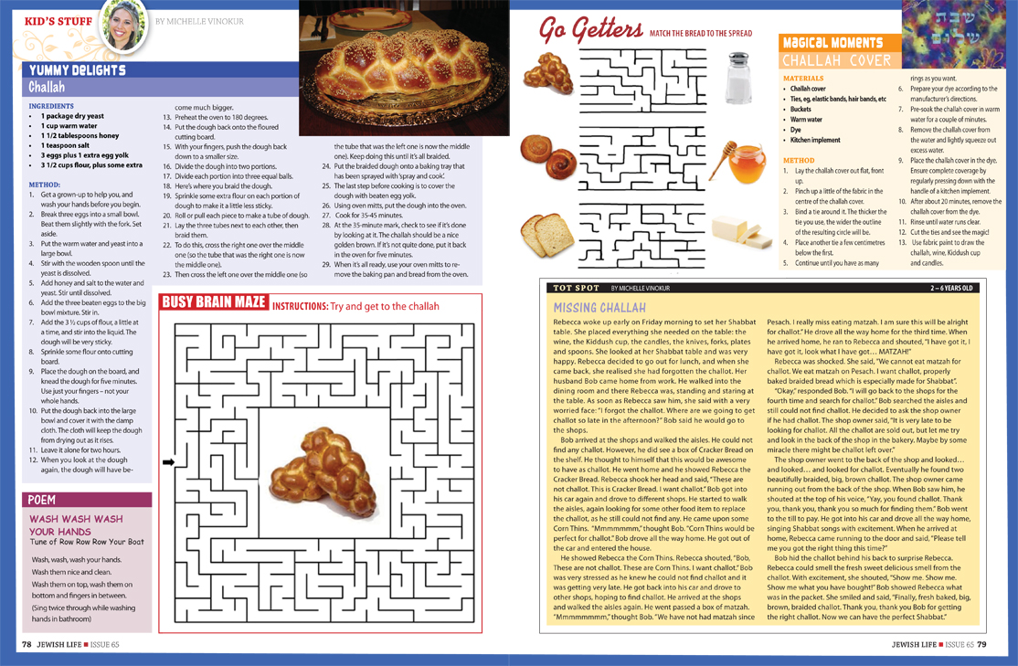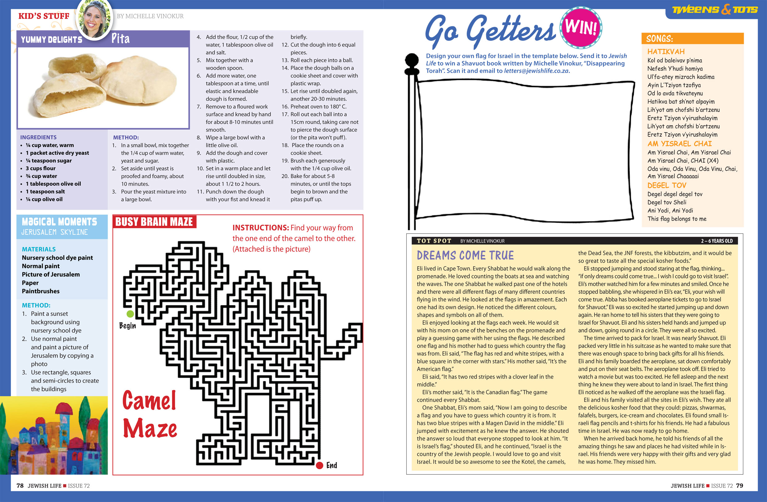 The Jewish Life is the highest circulating publication to the SA Jewish community. The magazine is filled with the best local and International content that conveys the essence of Jewish life. Readers can engage in numerous articles about lifestyle, parenting, business, belief, philosophy, history, health, community. Included in the magazine is a section dedicated to children's education. The children's section provides games, stories, recipes and fun activities that impart jewish values and beliefs. View all the children's pages below and have fun doing all the activities with your children; or you can buy the magazine. The magazine is also available nationwide in South Africa in all shuls, Jewish day schools, selected retail outlets, as well as on all El Al flights from Johannesburg to Israel (business and economy Class).