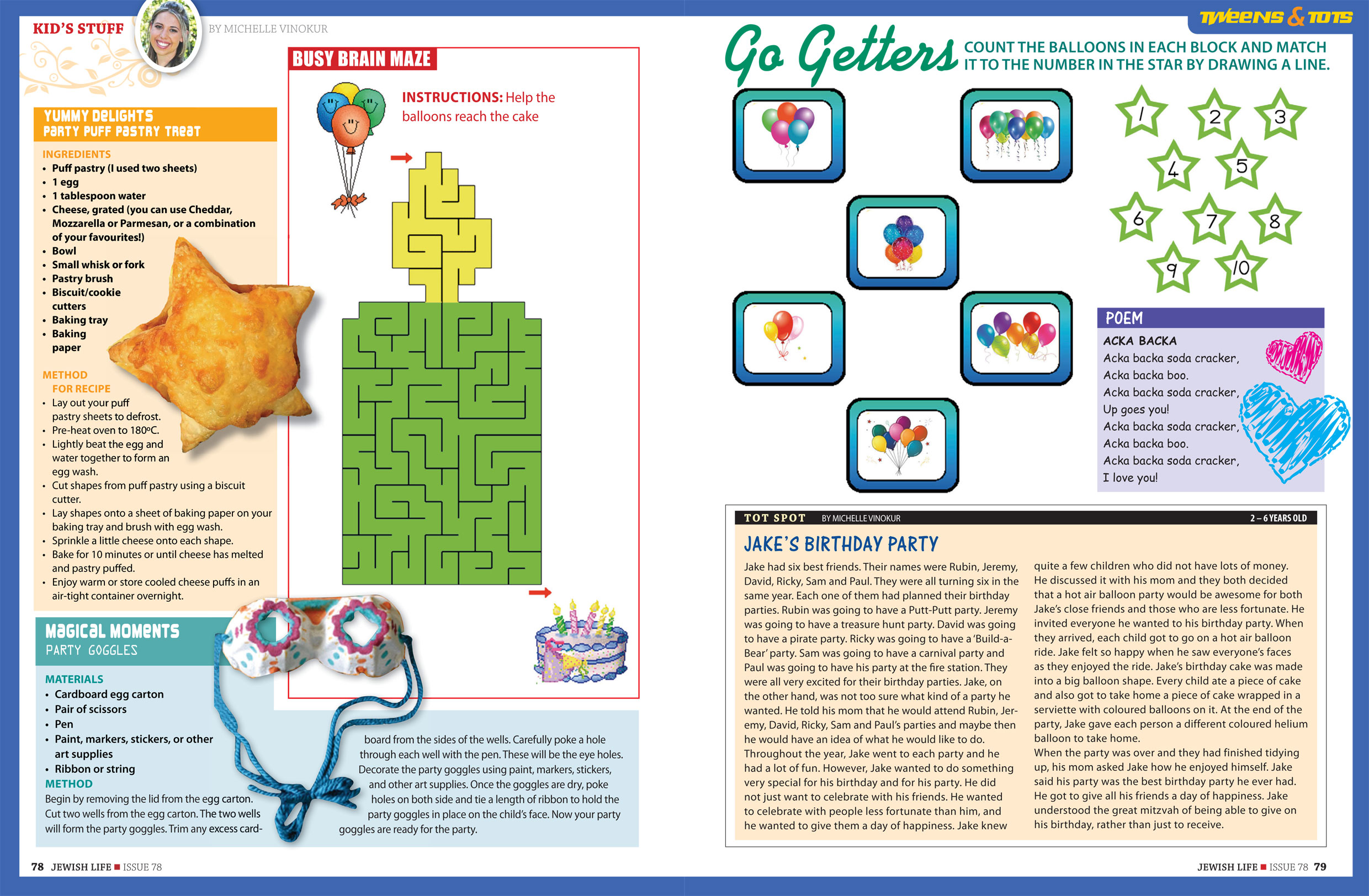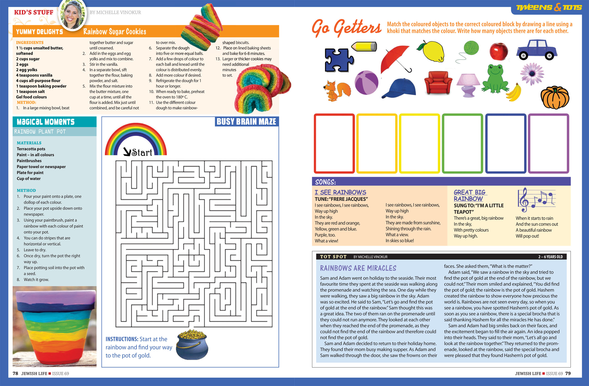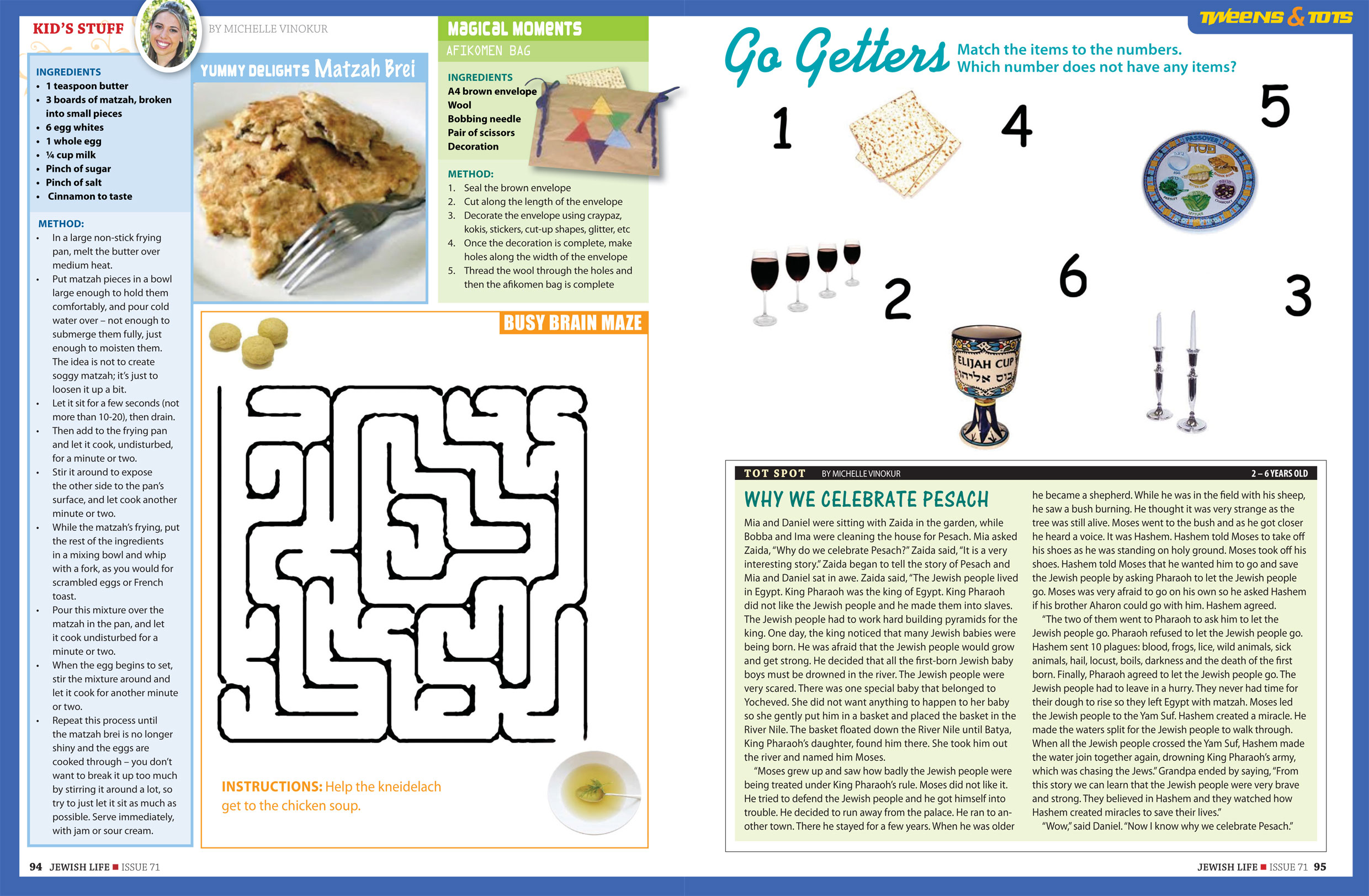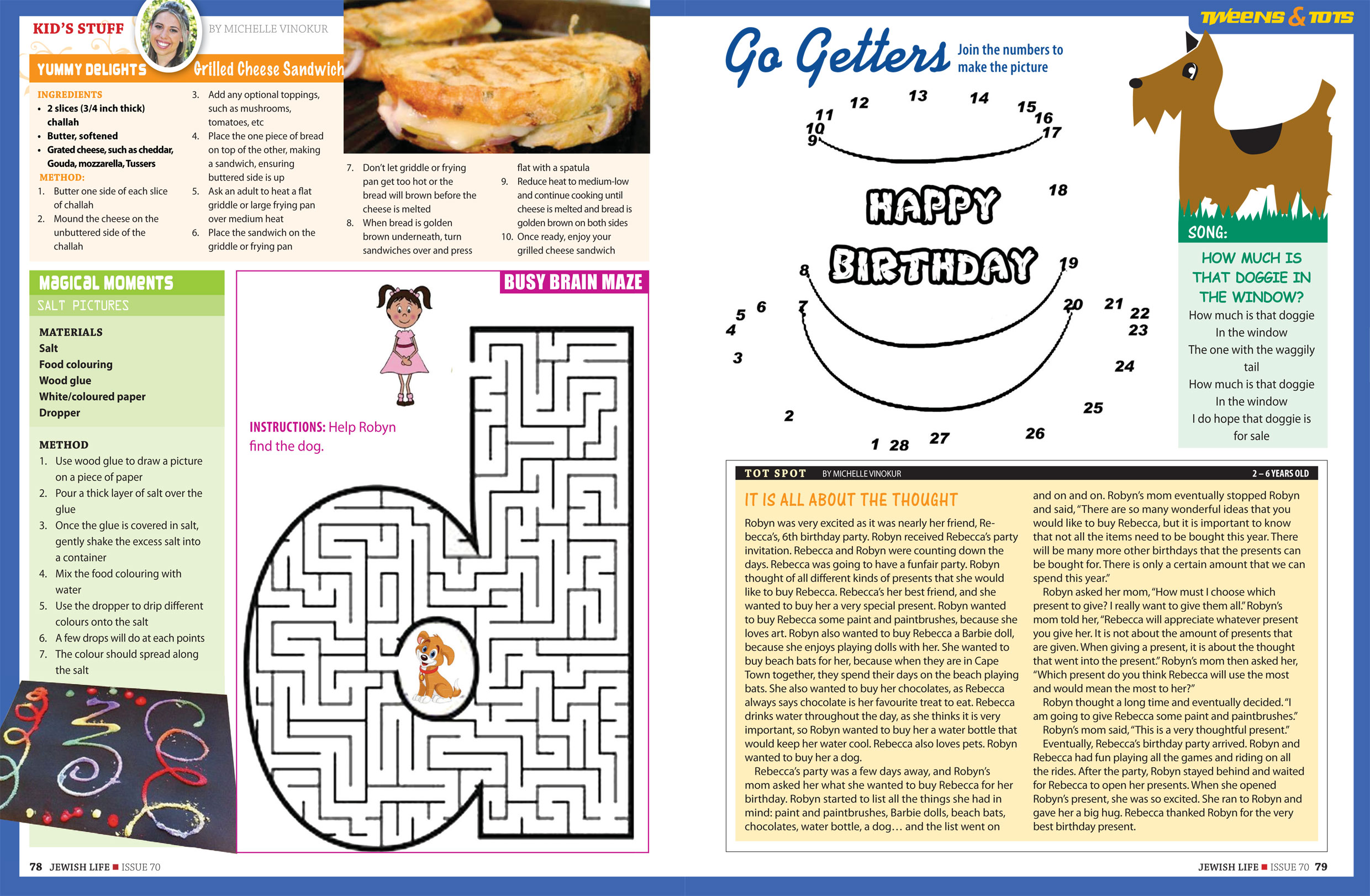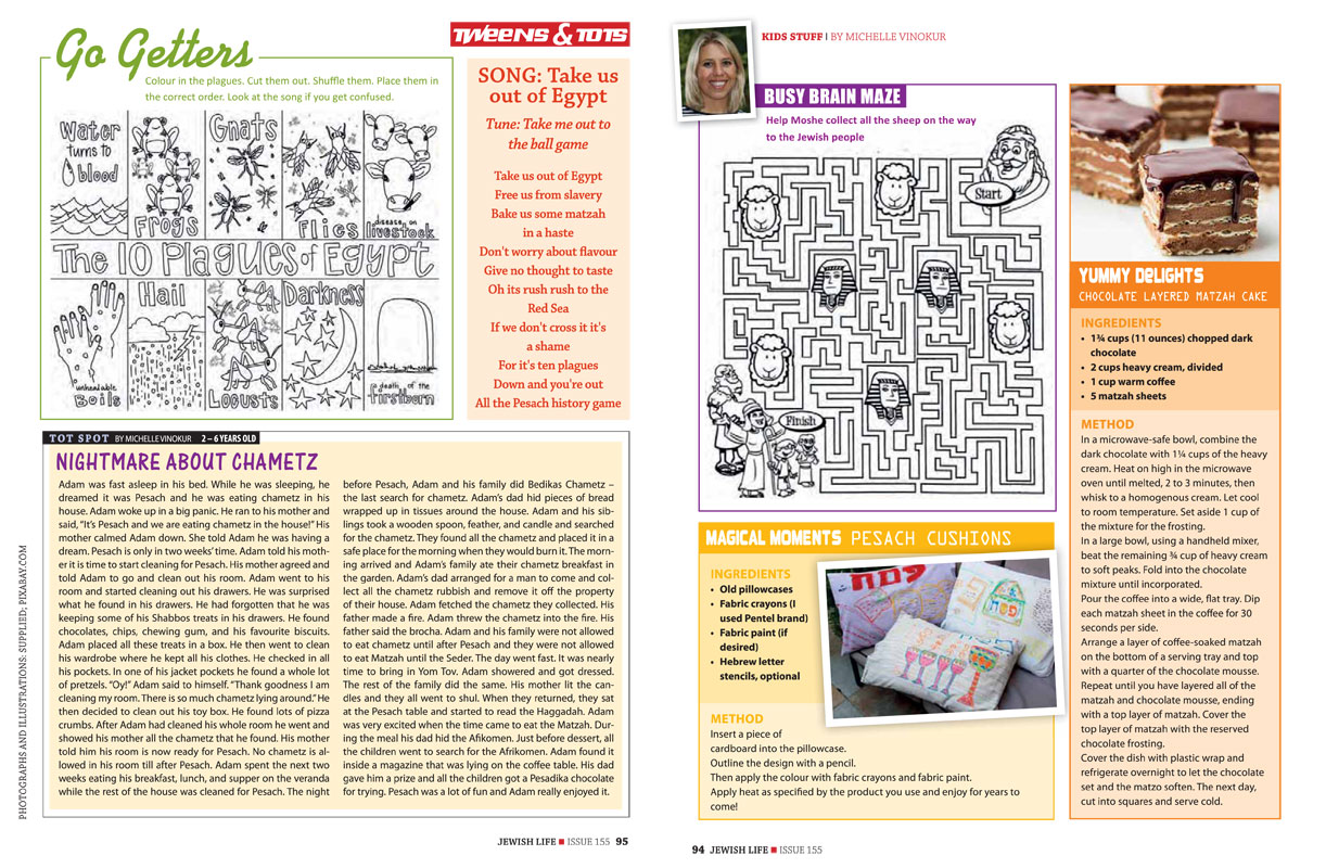 The Jewish Life is the highest circulating publication to the SA Jewish community. The magazine is filled with the best local and International content that conveys the essence of Jewish life. Readers can engage in numerous articles about lifestyle, parenting, business, belief, philosophy, history, health, community. Included in the magazine is a section dedicated to children's education. The children's section provides games, stories, recipes and fun activities that impart jewish values and beliefs. View all the children's pages below and have fun doing all the activities with your children; or you can buy the magazine. The magazine is also available nationwide in South Africa in all shuls, Jewish day schools, selected retail outlets, as well as on all El Al flights from Johannesburg to Israel (business and economy Class).